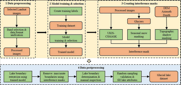 兴都库什—喀喇昆仑—喜马拉雅(HKH)地区的冰湖变化,是气候变化的重要指示器。由于该地区地形极为复杂,加之常年受到云层遮挡、地形阴影以及季节性积雪覆盖的影响,这些因素显著制约了冰湖自动制图的精度,使得对该地区冰湖现状及其动态变化的认知仍存在较大局限。
