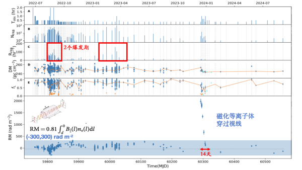 研究团队利用FAST的超高灵敏度,对FRB 20220529开展了长达2.2年的监测。在前一年半的常规监测中,反映传播路径上自由电子密度与磁场强度的关键参数RM始终在-300至+300弧度/平方米的范围内小幅波动。然而,在2023年12月,团队观测到该暴源的RM在短时间内急剧跃升至约2000弧度/平方米,变化幅度高达此前标准差的20倍,随后在两周内单调下降并恢复至常态。这种剧烈、快速且持续数周的磁环境演化现象,在国际上尚属首次被观测到。