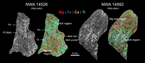 研究团队利用扫描电镜、电子探针、激光剥蚀电感耦合等离子体质谱和高分辨二次离子质谱等分析技术,对两块发现于2021年的月球陨石NWA 14526和NWA 14992,开展了详细的岩相学、矿物学、地球化学和同位素年代学研究。研究结果表明,NWA 14526和NWA 14992在岩相结构、矿物成分、地球化学特征和结晶年龄上高度一致,具有成对关系,且两者均呈现出独特的岩性二分性:富镁区的矿物成分较原始;富铁区的矿物成分更偏演化,且富集晚期结晶类型。