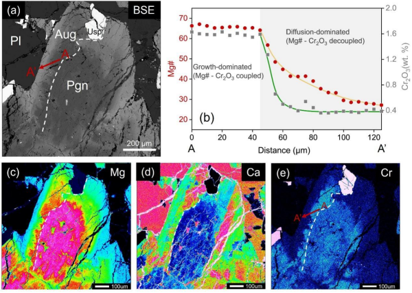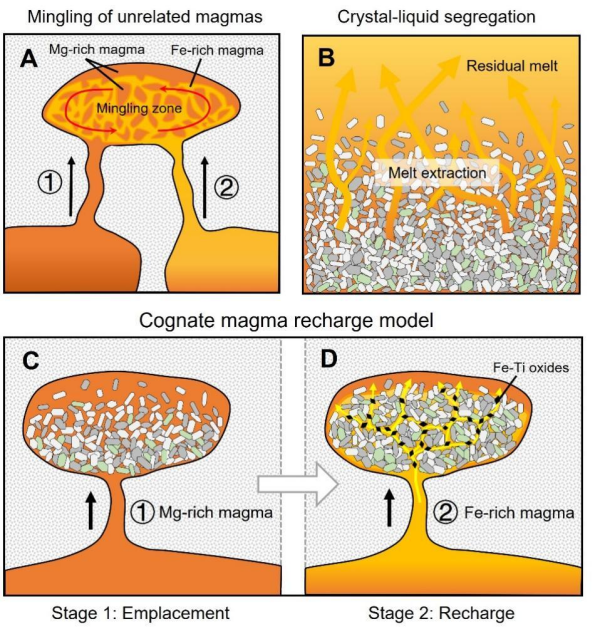 综合辉石中熔蚀结构、铬元素阶梯式分布等开放系统证据,研究团队认为,这种罕见的岩性二分性是由岩浆补给作用驱动产生的,并据此提出了同源岩浆补给模型:约30亿年前,由月球内部早期侵入的富镁岩浆在岩浆房部分结晶后,又有一股演化的相对富铁岩浆“接力”注入,两者混合、反应,最终形成了两类岩性共存的结构。